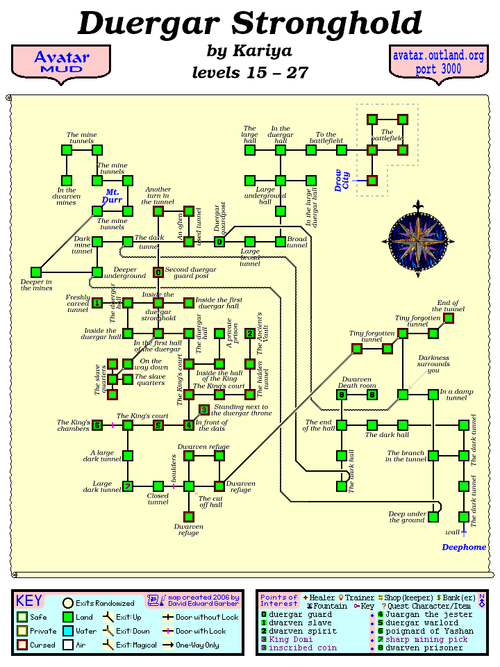 Revision as of 11:00, 19 February 2011 by Ylem (talk | contribs) (uploaded a new version of "File:Avatar MUD Area Map - Duergar Stronghold.GIF": Update connection)